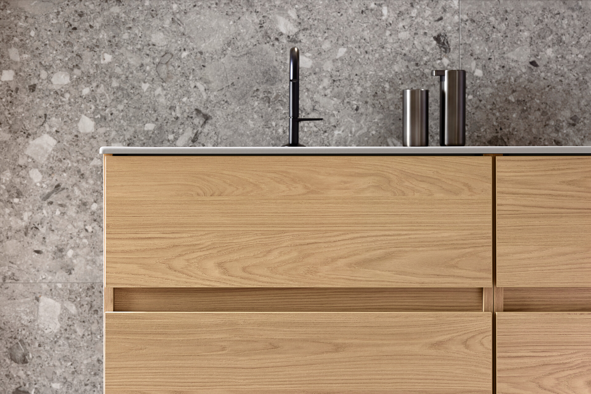 Das neue Bild mit grifflosen Fronten erscheint umso konsequenter, als sys30 – mit Ausnahme eines Waschmaschinenschranks – ein Badmöbelprogramm mit durchgehend wandhängenden Elementen ist. Passend zum betont horizontalen Design der neuen Griffvariante hat burgbad daher Holzdekore und Echtholzfurnierfronten für sämtliche Unterschränke des sys30-Programms auf einen horizontalen Maserungsverlauf vereinheitlicht.